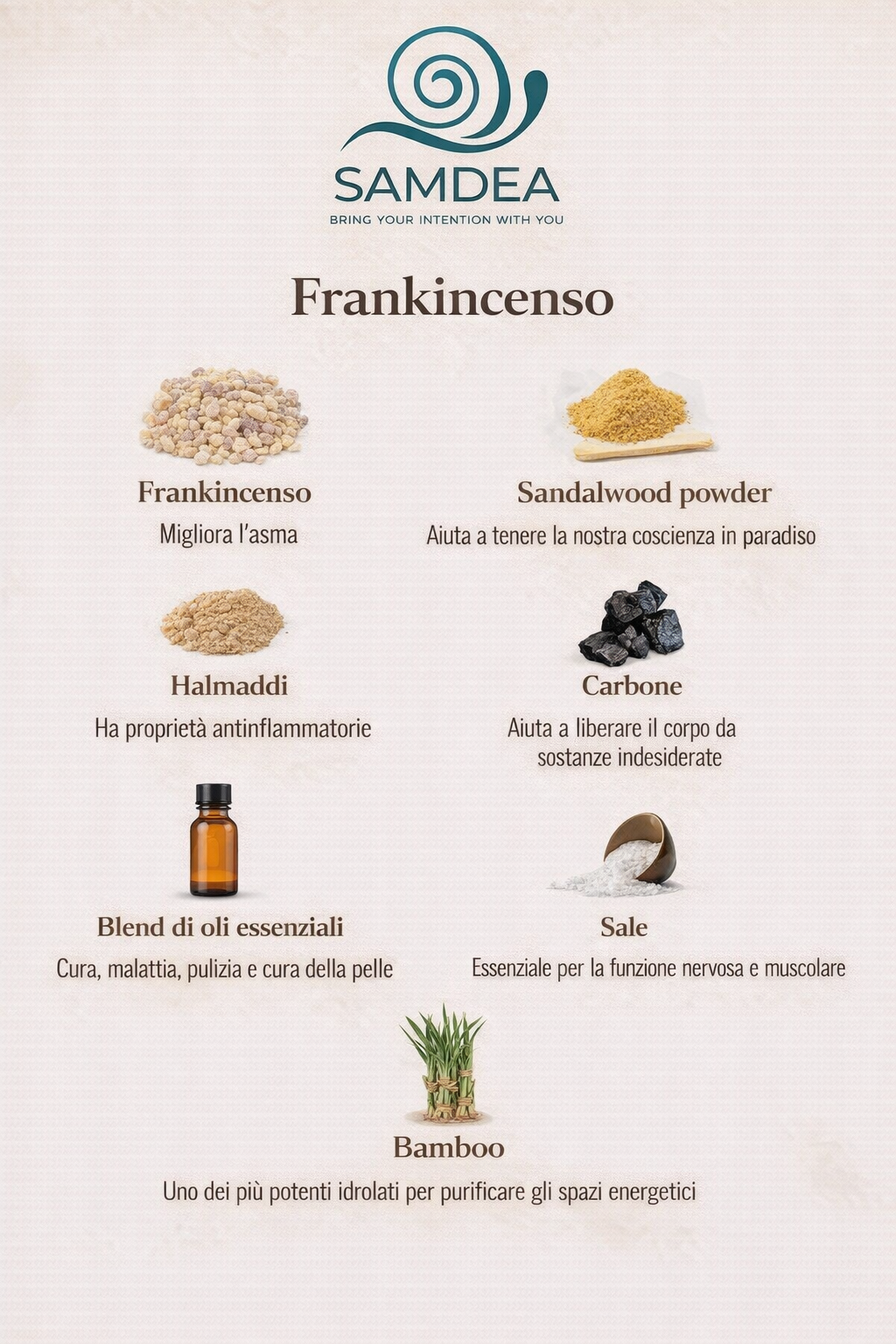 Incenso (Frankincense): Per radicare l'energia ed elevare lo spirito.