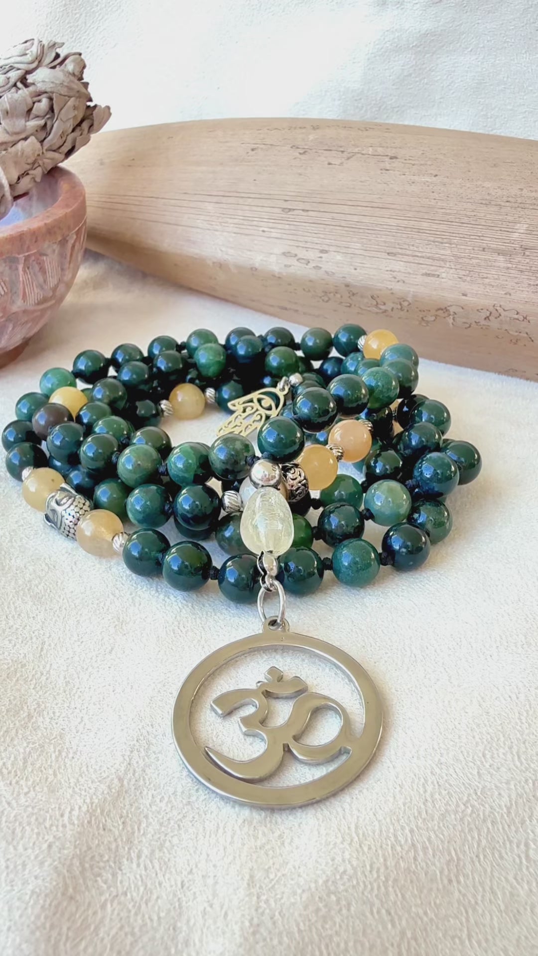 Green Mala for Meditation – Moss Agate, Citrine & Yellow Jade for Clarity and New Beginnings