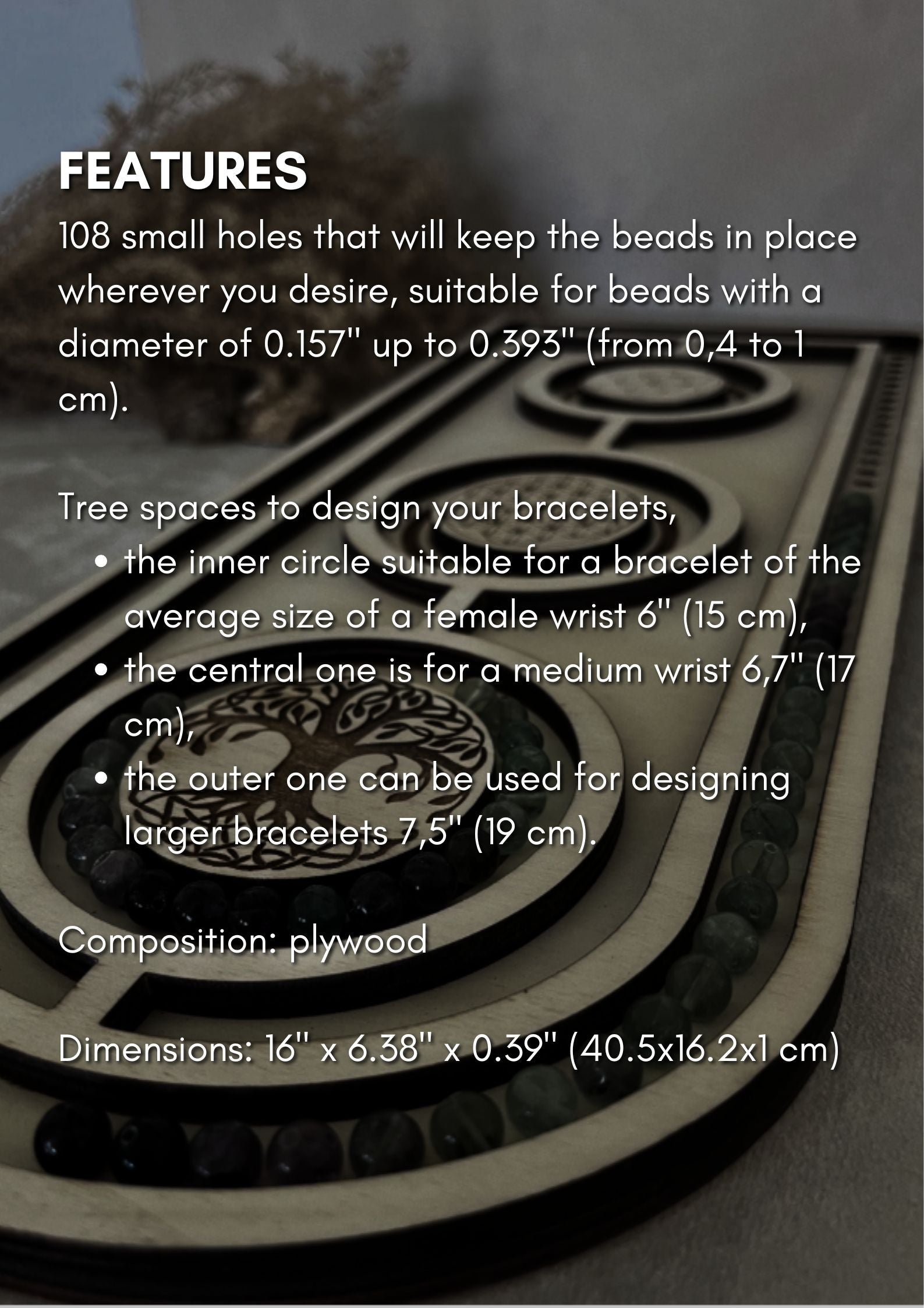 A board with 108 small holes that will keep the beads in place wherever you desire, suitable for beads with a diameter of 0.157" up to 0.393" (from 0,4 to 1 cm).